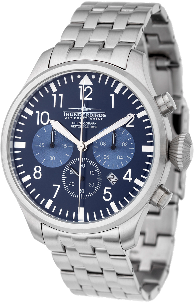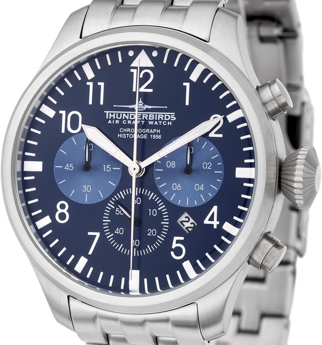 Herrenchronograph (Ø 47 mm) aus Edelstahl mit Ionenbeschichtung . Ziffernblatt im Fliegerdesign. Miyota Chronographen-Werk 6S20 mit Datum. Wasserdichtes Gehäuse (5ATM). Massives Edelstahlband mit Sicherheitsverschluss.
